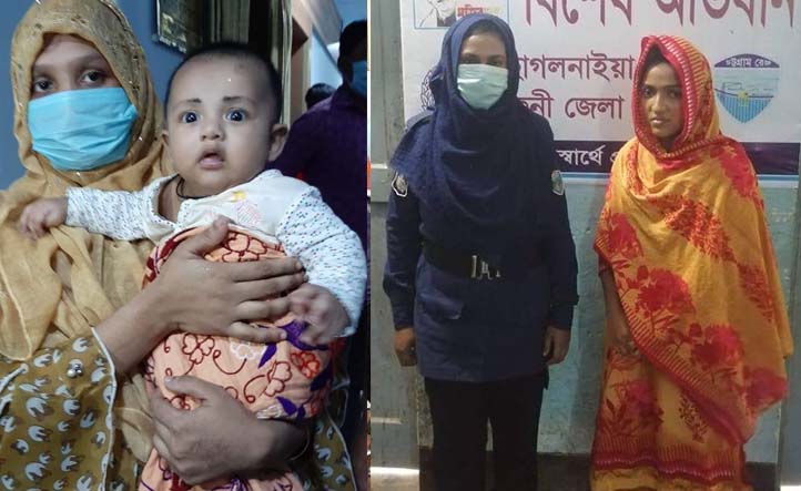 উদ্ধারের পর মায়ের কোলে শিশু জুনাঈদ (বামে), পুলিশের হাতে গ্রেফতার রোকাসানা আক্তার বিথি (ডানে)